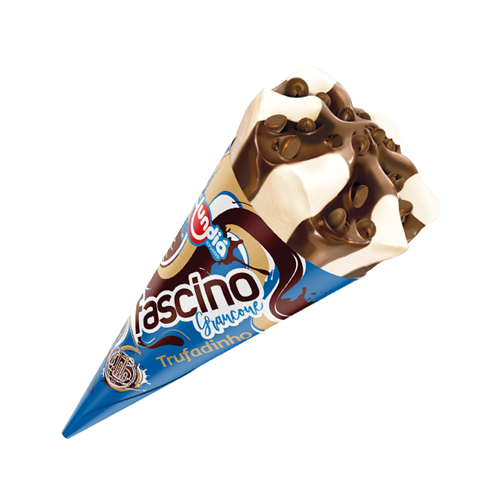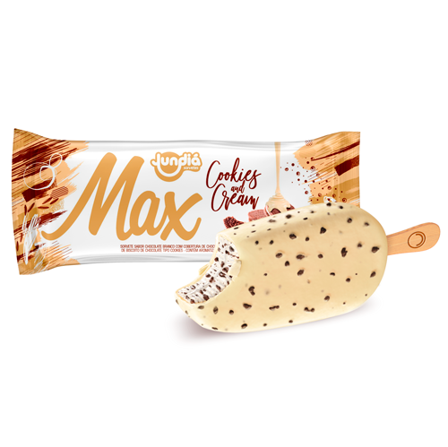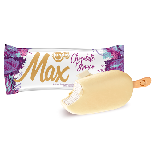 | picolé de chocolate, envolvido com creme suiço, com cobertura crocante de chocolate branco. |